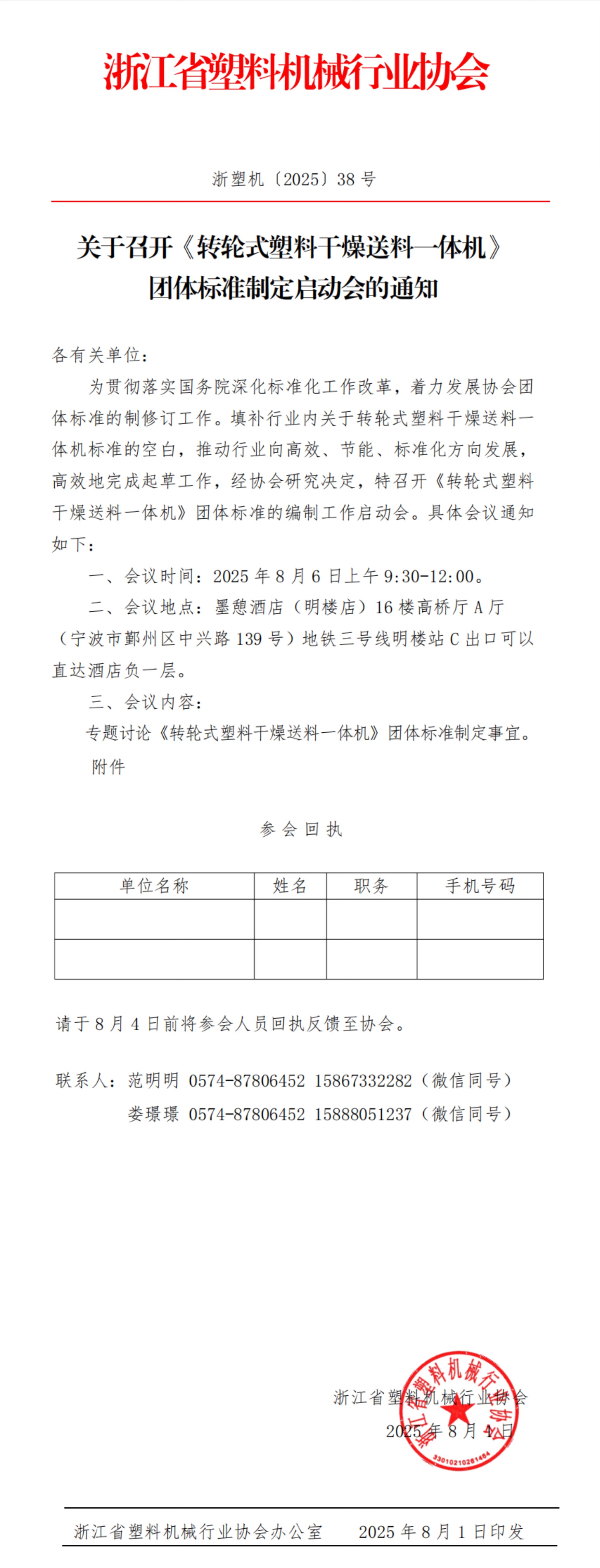 关于召开《转轮式塑料干燥送料一体机》团体标准制定启动会的通知